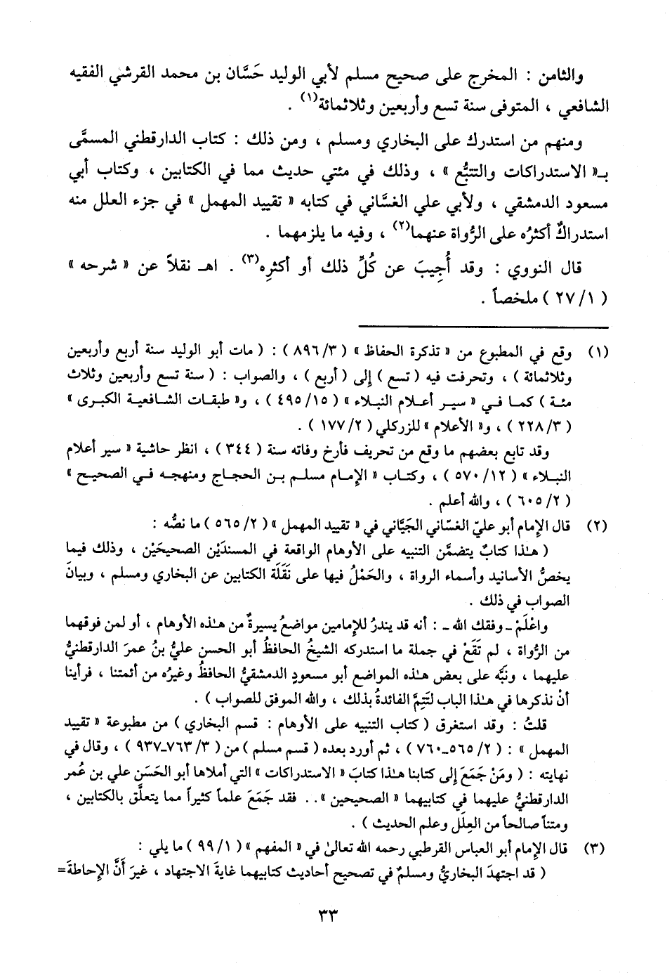 واعْلَمْ -وفقك الله-: أنه قد يندرُ للإِمامين مواضعُ يسيرةٌ من هذه الأوهام، أو لمن فوقهما من الرُّواة، لم تَقَعْ في جملة ما استدركه الشيخُ الحافظُ أبو الحسن عليُّ بن عمرَ الدارقطنيُّ عليهما، ونَبَّه على بعض هذه المواضع أبو مسعودٍ الدمشقي الحافظُ وغيرُه من أئمتنا، فرأينا أنْ نذكرها في هذا الباب لتَتِمَّ الفائدةُ بذلك، والله الموفق للصواب).