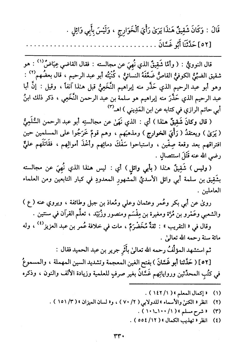 قال النووي: (وأمّا شَقِيقٌ الذي نُهِيَ عن مجالسته: فقال القاضي عِيَاضٌ (١): هو شقيق الضبِّيُّ الكوفي القاصُّ ضَعَّفَهُ النسائيُّ، كُنْيته أبو عبد الرحيم، قال بعضُهم (٢): وهو أبو عبد الرحيم الذي حَذَّر منه إبراهيم النَّخَعِيُّ قبل هذا آنفا، وقيل: إن أبا عبد الرحيم الذي حَذَّرَ منه إبراهيم هو سلمة بن عبد الرحمن النَّخَعِي، ذكر ذلك ابنُ أبي حاتم الرازي في كتابه عن ابن المَدِيني) اهـ (٣)
