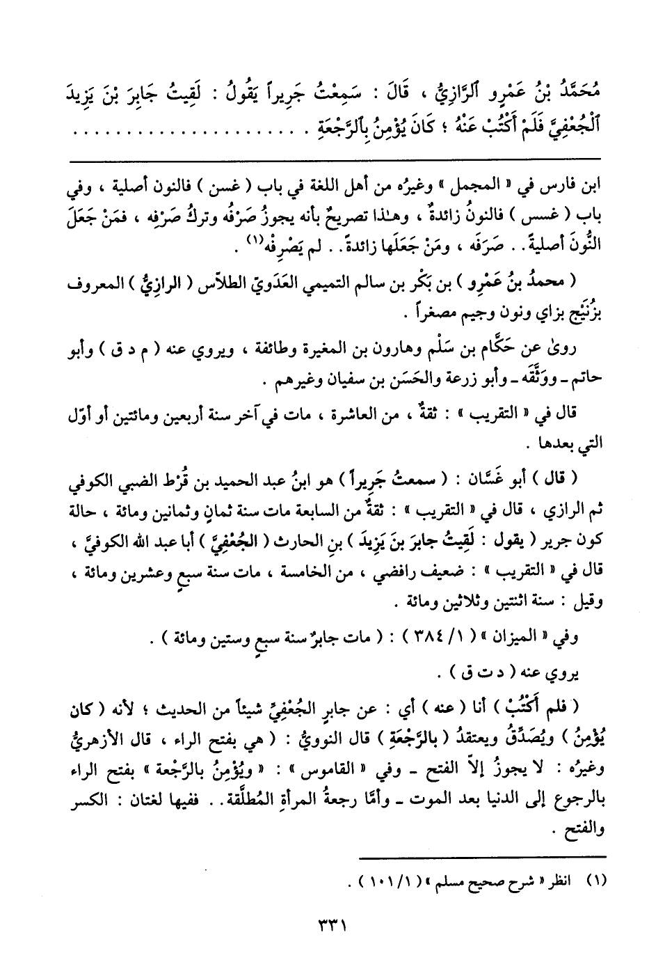 محمد بْنُ عَمْرٍو الرَّازِيُّ، قَال: سَمِعْتُ جَرِيرًا يَقُولُ: لَقِيتُ جَابِرَ بْنَ يَزِيدَ الْجُعْفِي فَلَمْ أَكْتُبْ عَنْهُ؛ كَانَ يُؤْمِنُ بِالرَّجْعَةِ