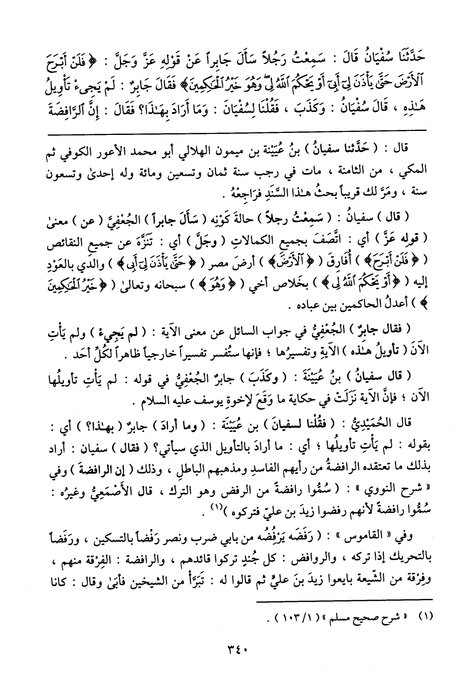 حَدَّثنا سُفْيَانُ قَال: سَمِعْتُ رَجُلًا سَألَ جَابِرًا عَنْ قَوْلهِ عَزَّ وَجَل: {فَلَنْ أَبْرَحَ الْأَرْضَ حَتَّى يَأْذَنَ لِي أَبِي أَوْ يَحْكُمَ اللَّهُ لِي وَهُوَ خَيرُ الْحَاكِمِينَ} فَقَال جَابِرٌ: لَمْ يَجئْ تأويلُ هَذِهِ، قَال سُفْيَانُ: وَكَذَبَ، فَقُلْنَا لِسُفْيَانَ: وَمَا أَرَادَ بِهَذَا؟ فَقَال: إِن الرَّافِضَةَ