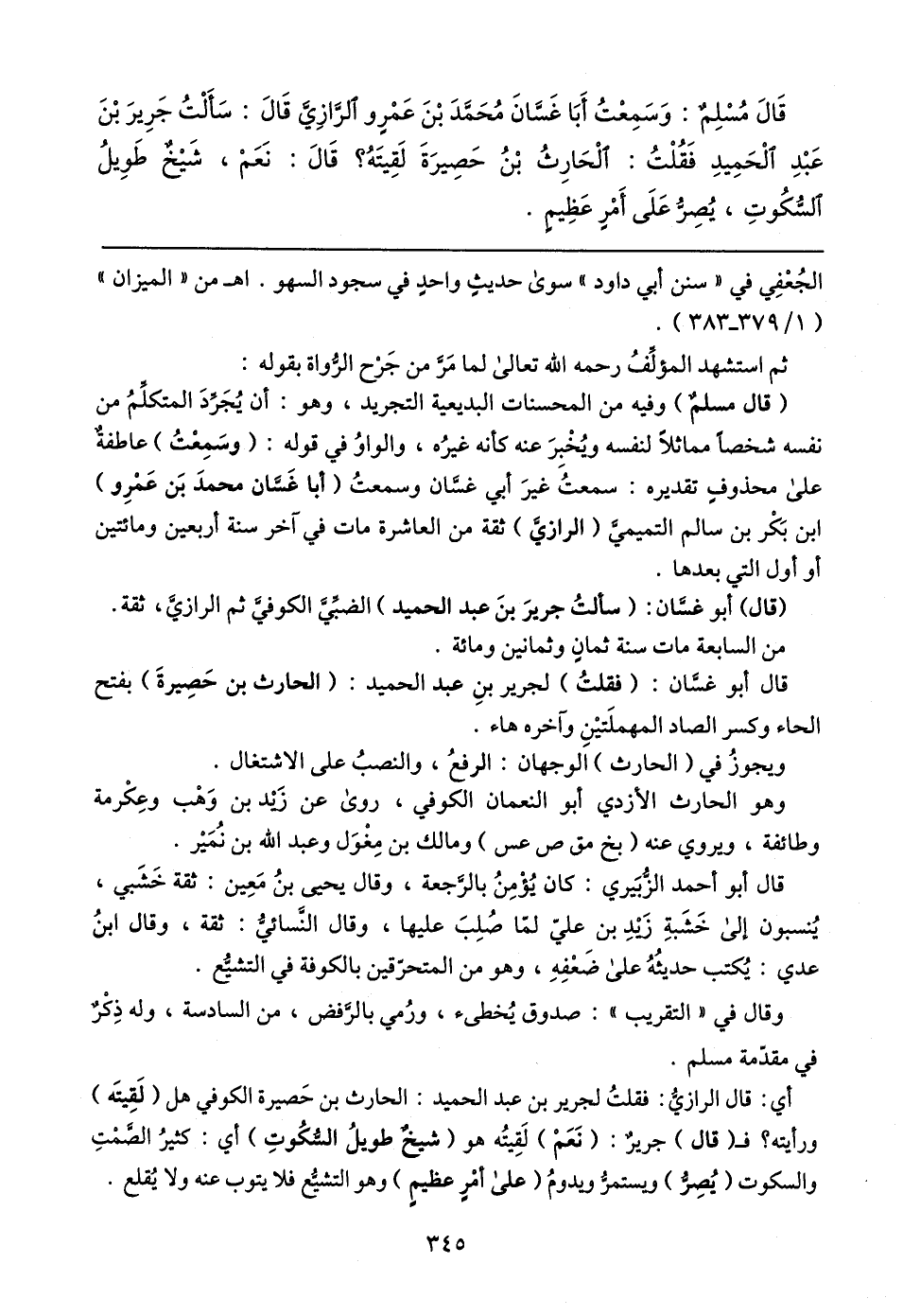 قَال مُسْلِمٌ: وَسَمِعْتُ أَبَا غَسَّانَ مُحَمَّدَ بْنَ عَمْرٍو الرَّازِيَّ قَال: سَأَلْتُ جَرِيرَ بْنَ عَبْدِ الْحَمِيدِ فَقُلْتُ: الْحَارِثُ بْنُ حَصِيرَةَ لَقِيتَهُ؟ قَال: نَعَمْ، شَيخٌ طَويلُ السُّكُوتِ، يُصِرُّ عَلَى أَمْرٍ عَظِيمٍ