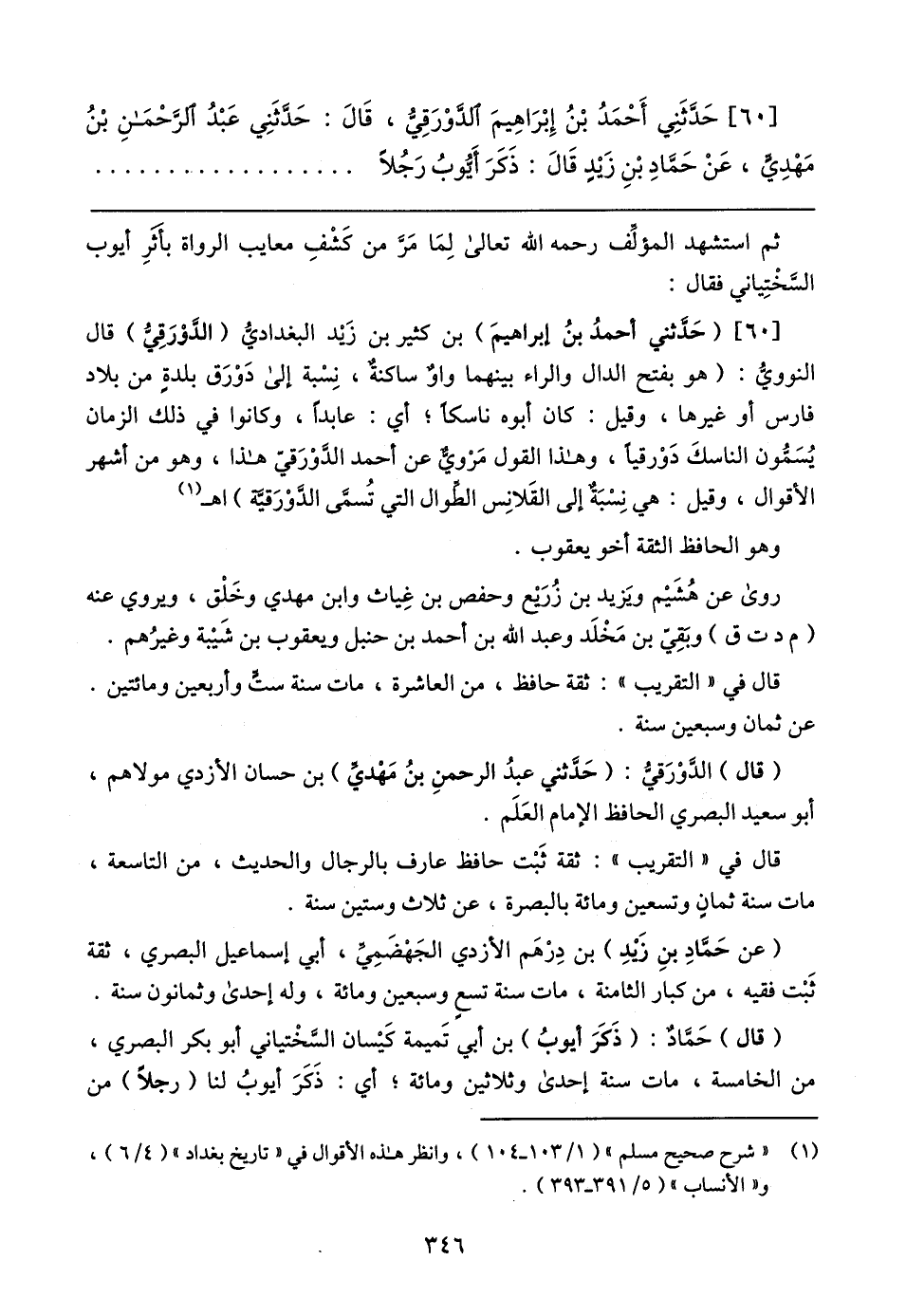 [٦٠] حَدَّثَنِي أَحْمَدُ بْنُ إِبْرَاهِيمَ الدَّوْرَقِيُّ، قَال: حَدثني عَبْدُ الرَّحْمَنِ بْنُ مَهْدِيٍّ، عَنْ حَمَّادِ بْنِ زَيدٍ قَال: ذَكَرَ أَيُوبُ رَجُلا