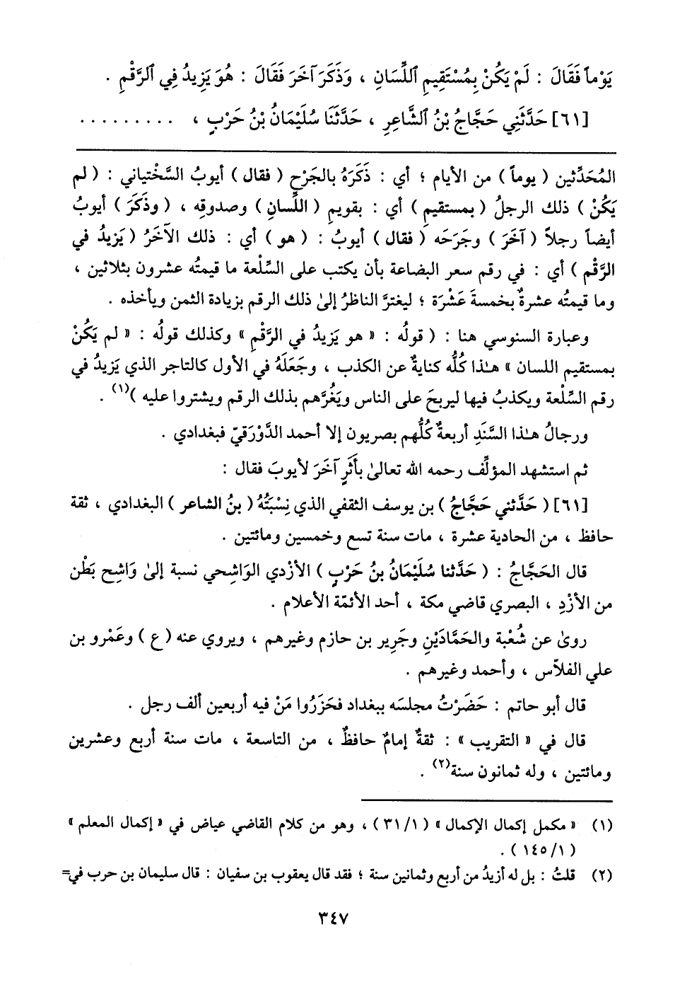 المُحَدِّثين (يومًا) من الأيام؛ أي: ذَكَرَهُ بالجَرْح (فقال) أيوبُ السَّخْتياني: (لم يَكُنْ) ذلك الرجلُ (بمستقيمِ) أي: بقويمِ (اللسانِ) وصدوقِه، (وذَكَرَ) أيوبُ أيضًا رجلًا (آخَرَ) وجَرَحَه (فقال) أيوبُ: (هو) أي: ذلك الآخَرُ (يَزيدُ في الرَّقْم) أي: في رقم سعر البضاعة بأن يكتب على السِّلْعة ما قيمتُه عشرون بثلاثين، وما قيمتُه عشرة بخمسةَ عَشْرَة؛ ليغترَّ الناظرُ إلى ذلك الرقم بزيادة الثمن ويأخذه.