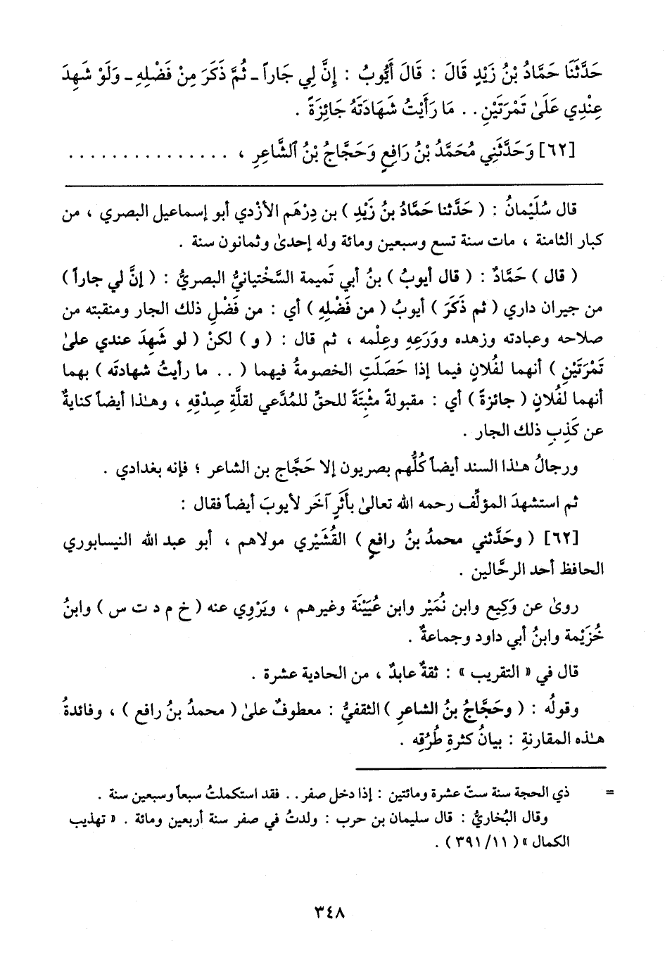 حَدَّثَنَا حَمادُ بْنُ زيدٍ قَال: قَال أَيُّوبُ: إِن لِي جَارًا -ثُمَّ ذَكَرَ مِنْ فَضْلِهِ- وَلَوْ شَهِدَ عِنْدِي عَلَى تَمْرَتَينِ .. مَا رَأَيتُ شَهَادَتَهُ جَائِزَةً.