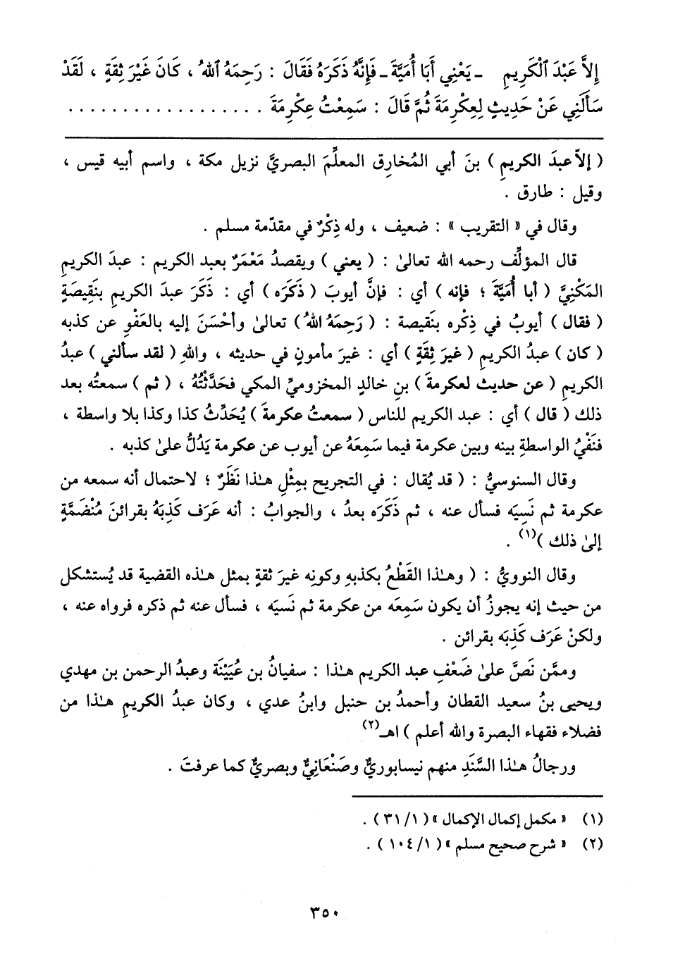 وممَّن نَصَّ على ضَعْفِ عبد الكريم هذا: سفيانُ بن عُيَينَة وعبدُ الرحمن بن مهدي ويحيى بن سعيد القطان وأحمدُ بن حنبل وابنُ عدي، وكان عبدُ الكريم هذا من فضلاء فقهاء البصرة والله أعلم) اهـ (٢)
