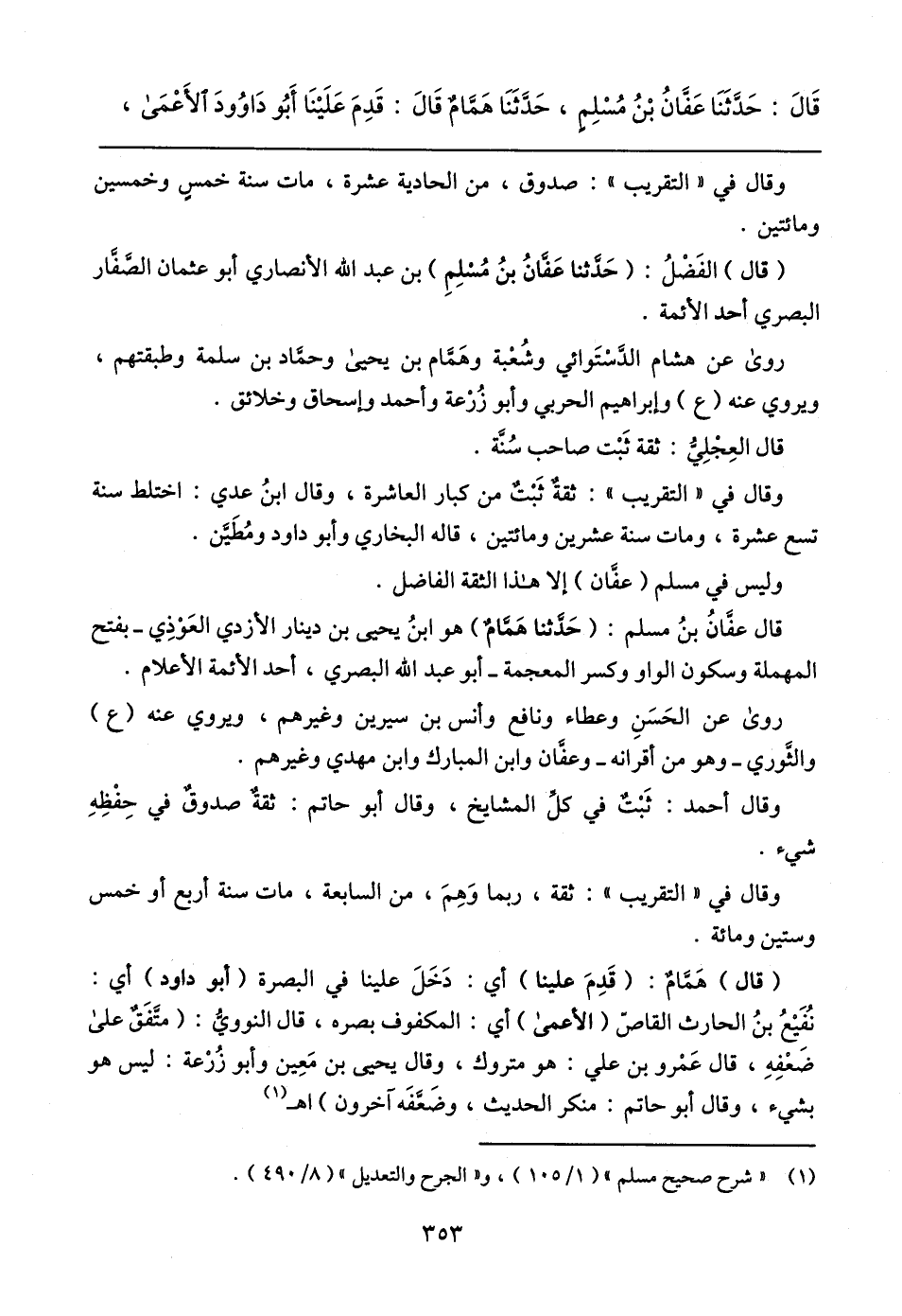 قَال: حَدَّثَنَا عَفَّانُ بْنُ مُسْلِمٍ، حَدَّثَنَا هَمَّامٌ قَال: قَدِمَ عَلَينَا أَبُو دَاوُودَ الأَعْمَى،