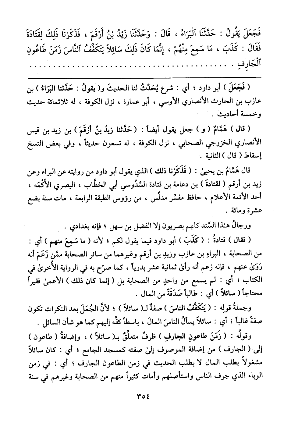 فَجَعَلَ يَقُولُ: حَدَّثَنَا الْبَرَاءُ، قَال: وَحَدَّثَنَا زَيدُ بْنُ أَرْقَمَ، فَذَكَرْنَا ذَلِكَ لِقتَادَةَ فَقَال: كَذَبَ، مَا سَمعَ مِنْهُمْ، إِنَّمَا كَانَ ذَلِكَ سَائِلًا يَتَكَفَّفُ النَّاسَ زَمَنَ طَاعُونِ الْجَارِفِ