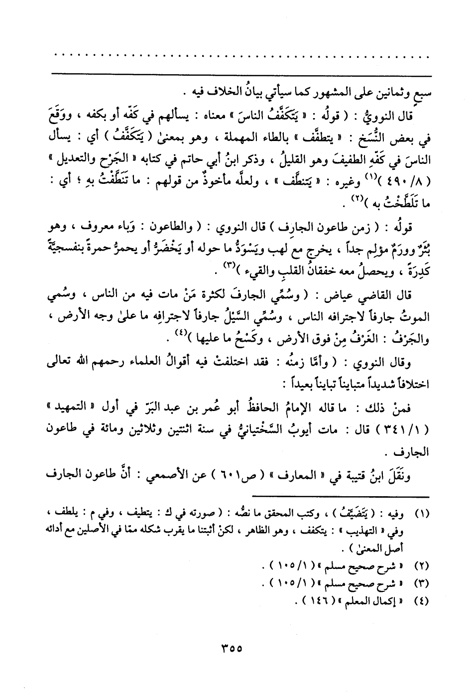 قولُه: (زمن طاعون الجارِف) قال النووي: (والطاعون: وَباء معروف، وهو بُثَرٌ وورَمٌ مؤلم جدًّا، يخرج مع لهب ويَسْوَدُّ ما حوله أو يَخْضَرُّ أو يحمرُّ حمرةً بنفسجيَّةً كَدِرَةً، ويحصلُ معه خفقانُ القلبِ والقيء) (٣).