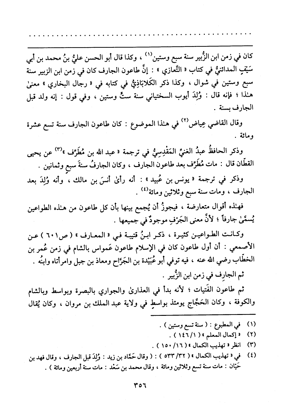 وكانت الطواعين كثيرة، ذكر ابنُ قتيبة في "المعارف" (ص ٦٠١) عن الأصمعيّ: أن أول طاعون كان في الإِسلام طاعون عَمواس بالشَّام في زمن عُمر بن الخطاب رضي الله عنه، فيه تُوفِّي أبو عُبَيدة بن الجَرَّاح ومعاذ بن جبل وامرأتاه وابنُه.