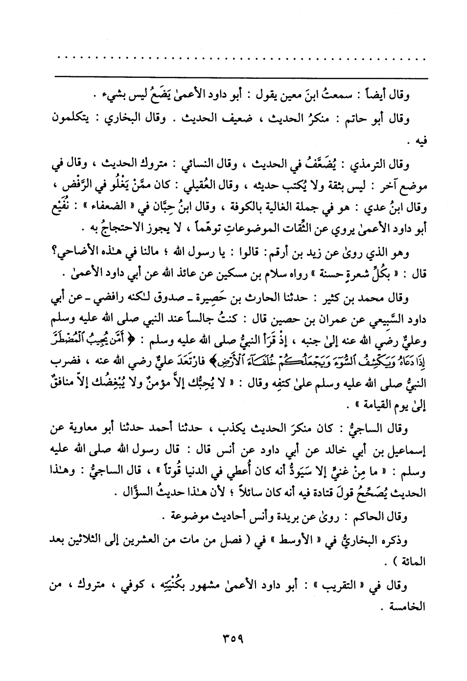 وقال التِّرْمِذِيّ: يُضَعَّفُ في الحديث، وقال النَّسائيّ: متروك الحديث، وقال في موضع آخر: ليس بثقة ولا يُكتب حديثه، وقال العُقيلي: كان ممَّنْ يَغْلُو في الرَّفْضِ، وقال ابنُ عدي: هو في جملة الغالية بالكوفة، وقال ابنُ حِبَّان في "الضعفاء": نُفيع أبو داود الأعمى يروي عن الثِّقات الموضوعاتِ توهّمًا، لا يجوز الاحتجاجُ به.