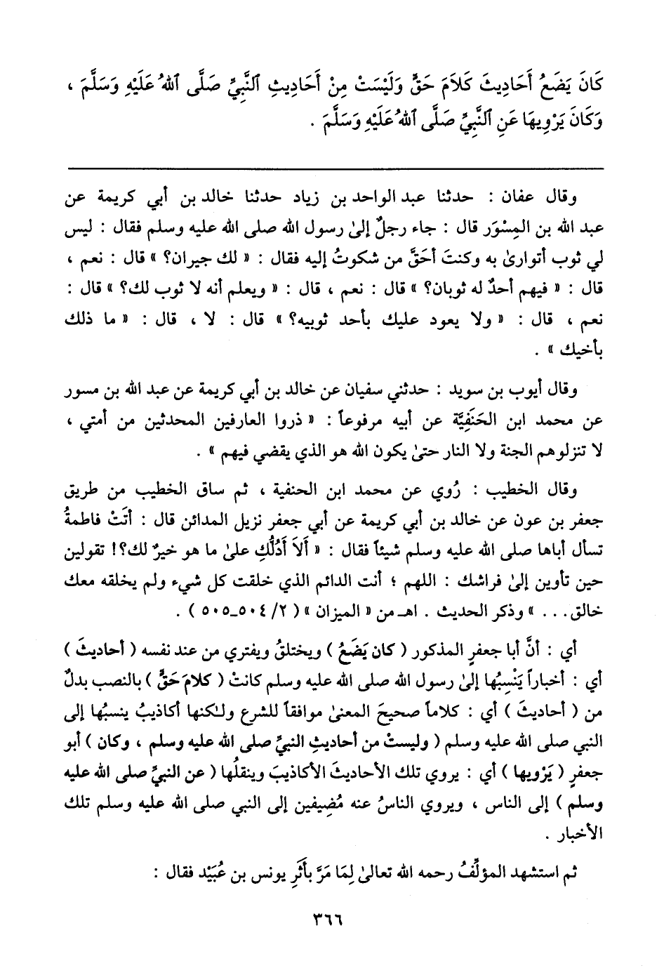 أي: أن أَبا جعفرٍ المذكور (كان يَضَعُ) ويختلقُ ويفتري من عند نفسه (أحاديثَ) أي: أخبارًا يَنْسِبُها إلى رسول الله صلى الله عليه وسلم كانتْ (كلامَ حَقٍّ) بالنصب بدلٌ من (أحاديثَ) أي: كلامًا صحيحَ المعنى موافقًا للشرع ولكنها كاذيبُ ينسبُها إلى النَّبِيّ صلى الله عليه وسلم (وليستْ من أحاديثِ النَّبِيّ صلى الله عليه وسلم، وكان) أبو جعفرٍ (يَرْويها) أي: يروي تلك الأحاديثَ الأكاذيبَ وينقلُها (عن النَّبِيِّ صلى الله عليه وسلم) إلى النَّاس، ويروي النَّاسُ عنه مُضِيفين إلى النَّبِيّ صلى الله عليه وسلم تلك الأخبار.