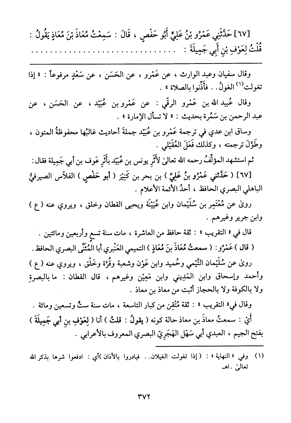 [٦٧] حَدَّثَنِي عَمْرُو بْنُ عَلِيٍّ أَبُو حَفْصٍ، قَال: سَمِعْتُ مُعَاذَ بْنَ مُعَاذٍ يَقُولُ: قُلْتُ لِعَوْفِ بْنِ أَبي جَمِيلَةَ: