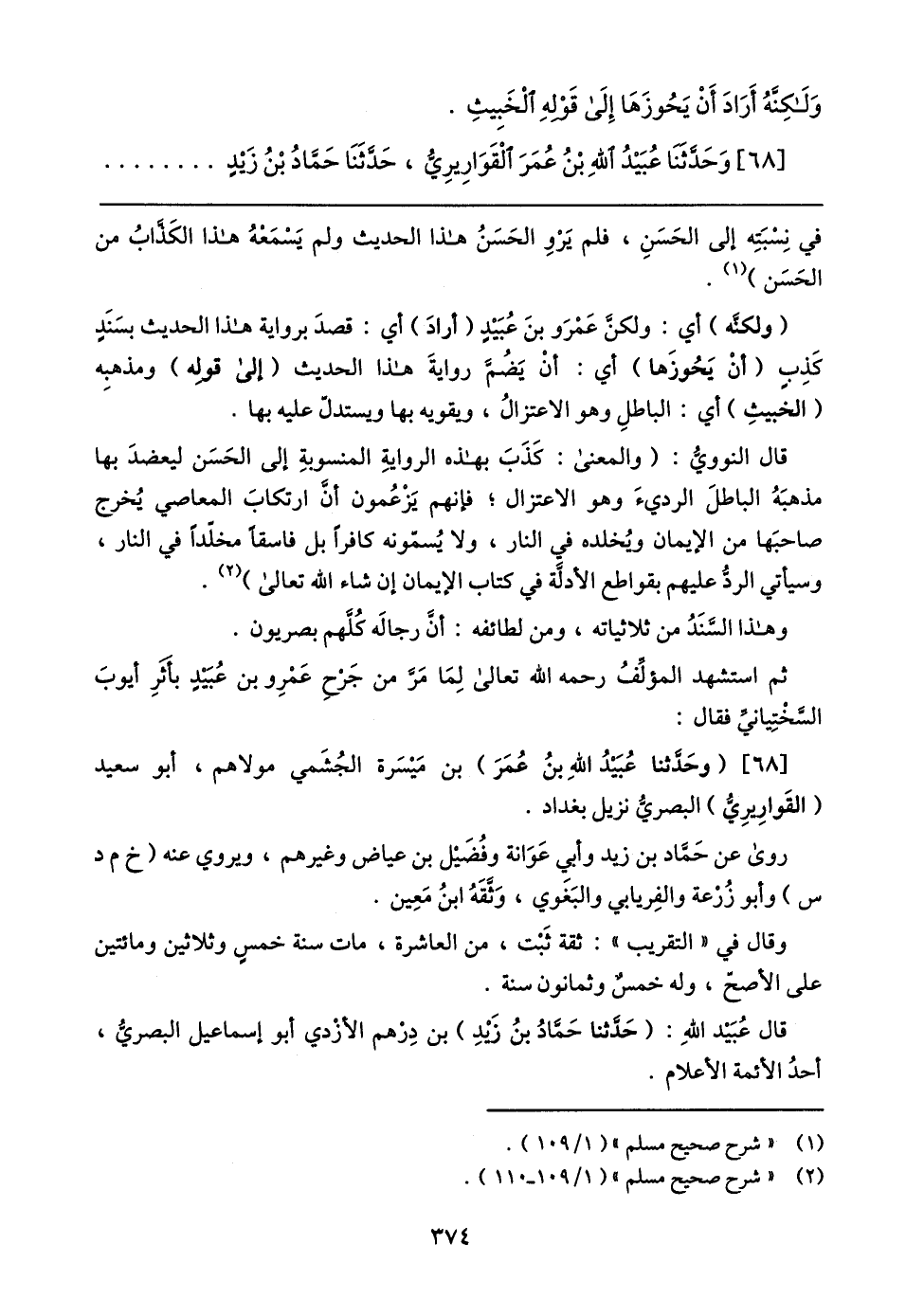 [٦٨] وَحَدَّثنا عُبَيدُ اللهِ بْنُ عُمَرَ الْقَوَارِيرِيُّ، حَدَّثَنَا حَمَّادُ بْنُ زَيدٍ