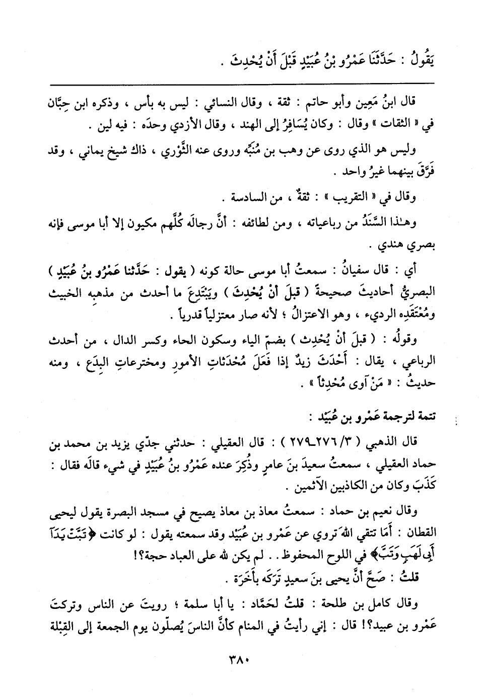 وقال نعيم بن حماد: سمعتُ معاذ بن معاذ يصيح في مسجد البصرة يقول ليحيى القطَّان: أَمَا تتقي اللهَ تروي عن عَمْرو بن عُبَيد وقد سمعته يقول: لو كانت {تَبَّتْ يَدَا أَبِي لَهَبٍ وَتَبَّ} في اللوح المحفوظ .. لم يكن لله على العباد حجة؟ !