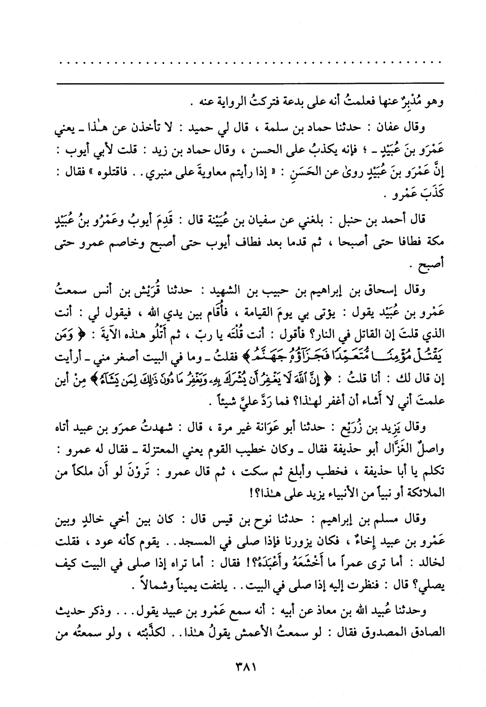 وقال عفان: حَدَّثَنَا حماد بن مسلمة، قال لي حميد: لا تأخذن عن هذا -يعني عَمْرَو بنَ عُبَيدٍ-؛ فإنَّه يكذبُ على الحسن، وقال حماد بن زيد: قلت لأبي أَيُّوب: إن عَمْرَو بنَ عُبَيدٍ روى عن الحَسَنِ: "إذا رأيتم معاويةَ على منبري .. فاقتلوه" فقال: كَذَبَ عَمْرو.