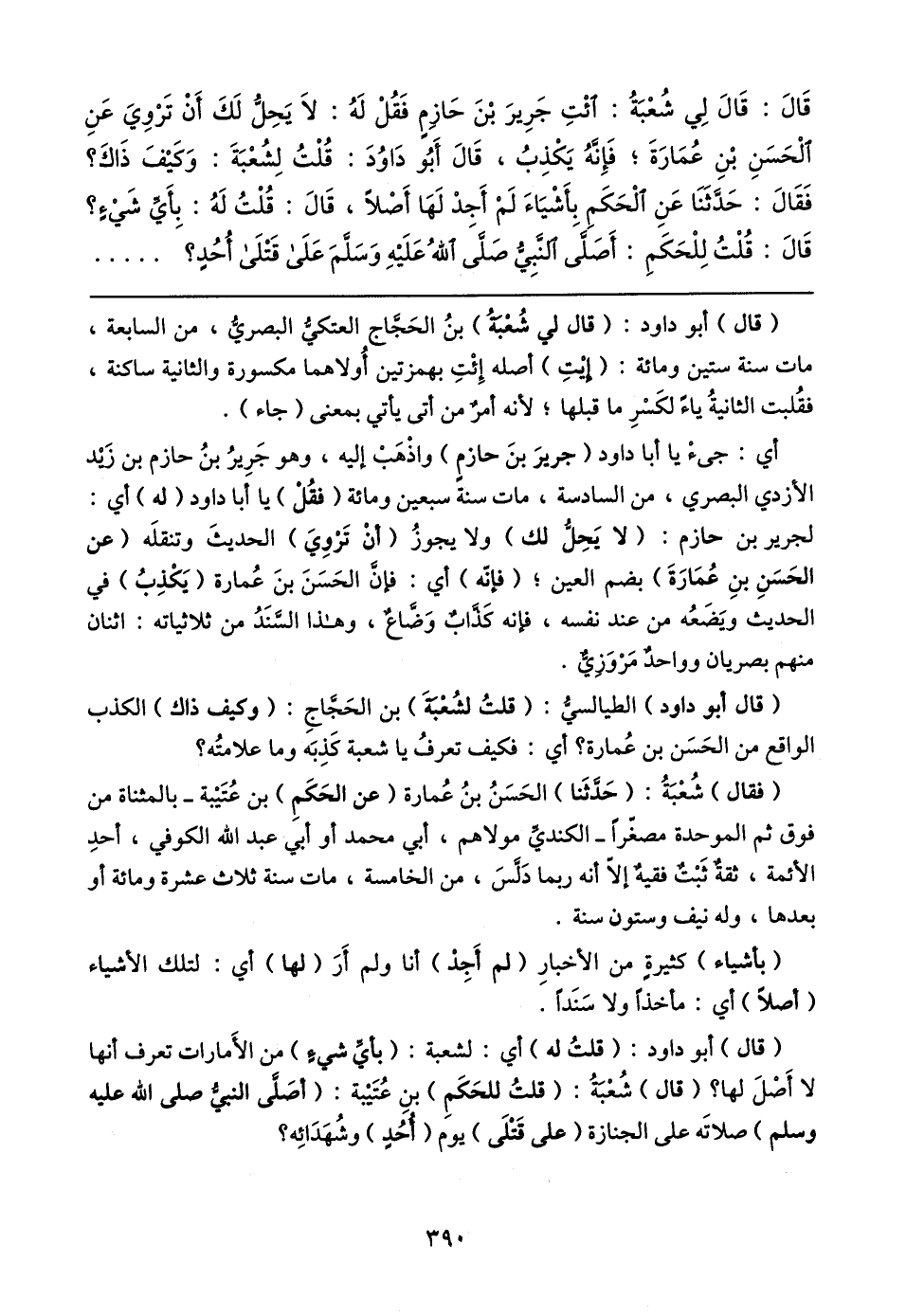 قَال: قَال لِي شُعْبَةُ: ائْتِ جَرِيرَ بْنَ حَازِمٍ فَقُلْ لَهُ: لا يَحِلُّ لَكَ أَنْ تَرْويَ عَنِ الْحَسَنِ بْنِ عُمَارَةَ؛ فَإِنَّهُ يَكْذِبُ، قَال أَبُو دَاوُدَ: قُلْتُ لِشُعْبَةَ: وَكَيفَ ذَاكَ؟ فَقَال: حَدَّثَنَا عَنِ الْحَكَمِ بِأَشْيَاءَ لَمْ أَجِدْ لَهَا أَصْلًا، قَال: قُلْتُ لَهُ: بِأَيِّ شَيءٍ؟ قَال: قُلْتُ لِلْحَكَمِ: أَصَلَّى النَّبِيُّ صلَّى اللهُ عَلَيهِ وَسلمَ عَلَى قَتْلَى أحُدٍ؟