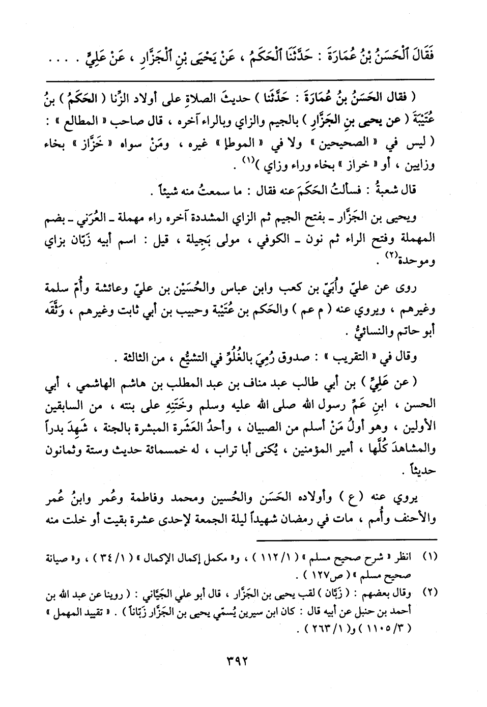 ويحيى بن الجَزَّار -بفتح الجيم ثم الزاي المشددة آخره راء مهملة- العُرَني -بضم المهملة وفتح الراء ثم نون- الكُوفيّ، مولى بَجِيلة، قيل: اسم أَبيه زَبّان بزاي وموحدة (٢).