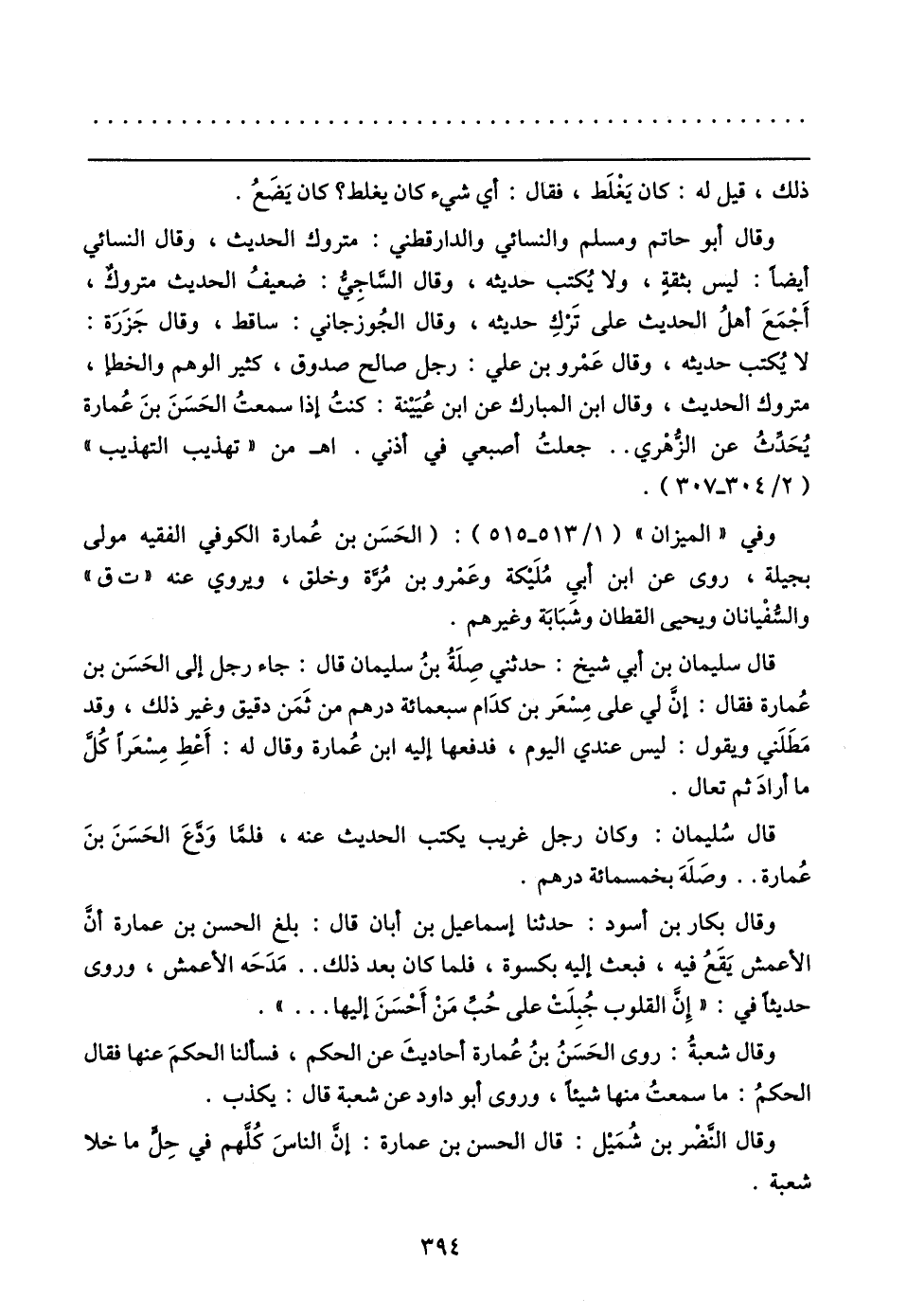 وفي "الميزان" (١/ ٥١٣ - ٥١٥): (الحَسَنُ بن عُمارة الكُوفيّ الفقيه مولى بجيلة، روى عن ابن أبي مُلَيكة وعَمْرو بن مُرّة وخلق، ويروي عنه "ت ق" والسُّفْيانان ويحيى القطَّان وشَبَابَة وغيرهم.