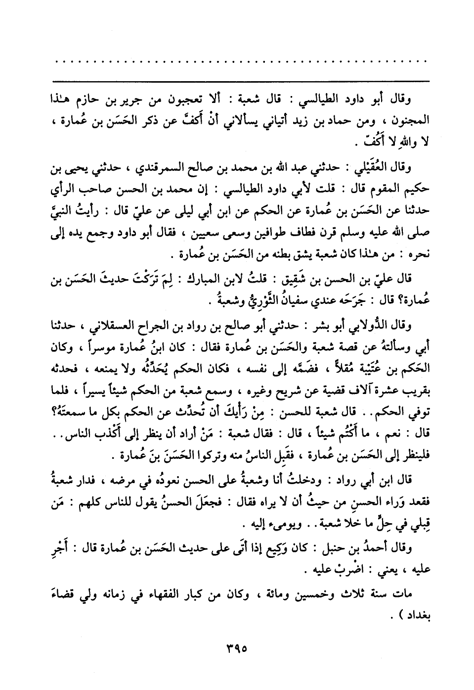 وقال العُقَيلي: حَدَّثني عبد الله بن محمَّد بن صالح السمرقندي، حَدَّثني يحيى بن حكيم المقوم قال: قلت لأبي داود الطَّيالِسيّ: إن محمَّد بن الحسن صاحب الرأي حَدَّثَنَا عن الحَسَنُ بن عُمارة عن الحكم عن ابن أبي ليلى عن علي قال: رأيتُ النبيَّ صلى الله عليه وسلم قرن فطاف طوافين وسعى سعيين، فقال أبو داود وجمع يده إلى نحره: من هذا كان شعبة يشق بطنه من الحَسَنُ بن عُمارة.