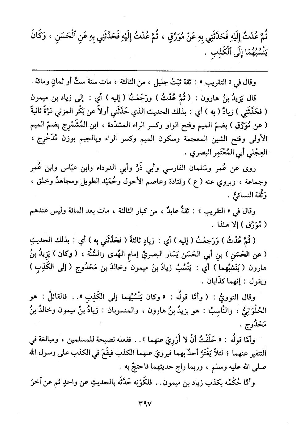 ثُمَّ عُدْتُ إِلَيهِ فَحَدَّثَنِي بِهِ عَنْ مُوَرِّقٍ، ثُمَّ عُدْتُ إِلَيهِ فَحَدَّثَنِي بِهِ عَنِ الْحَسَنِ، وَكَانَ يَنْسُبُهُمَا إِلَى الْكَذِبِ