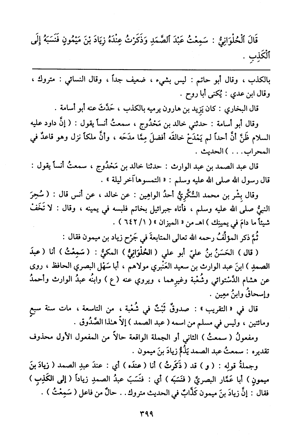 وجملةُ قوله: (و) قد (ذَكَرتُ) أنا (عندَه) أي: عندَ عبد الصمد (زيادَ بنَ ميمونٍ) أَبا عَمَّار البَصْرِيَّ (فنَسَبَه) أي: فنَسَبَ عبدُ الصمدِ زيادًا (إلى الكَذِبِ) فقال: إنَّ زيادَ بنَ ميمون كَذَّابٌ في الحديث متروك .. حالٌ من فاعل (سَمِعْتُ).