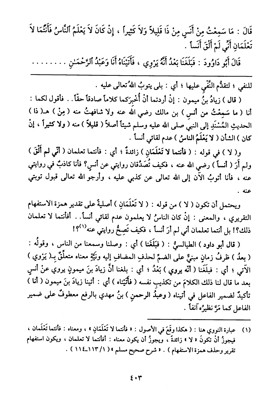 (١) عبارة النووي هنا: (هكذا وقعَ في الأصول: "فأنتما لا تَعلَمَانِ"، ومعناه: فأنتما تَعلَمان، فيجوزُ أن تكونَ "لا" زائدة، ويجوزُ أن يكون معناه: أفأنتما لا تعلمان، ويكون استفهام تقرير وحذف همزة الاستفهام). "شرح صحيح مسلم" (١/ ١١٣ - ١١٤).