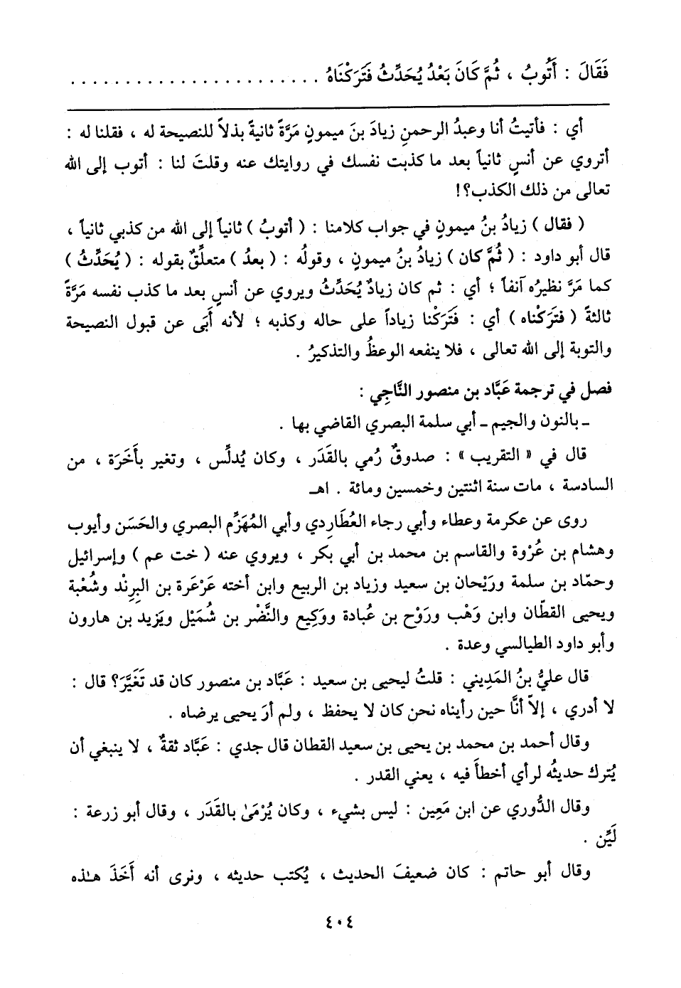وقال أحمد بن محمد بن يحيى بن سعيد القطان قال جدي: عَبَّاد ثقةٌ، لا ينبغي أن يترك حديثُه لرأي أخطأ فيه، يعني القدر.