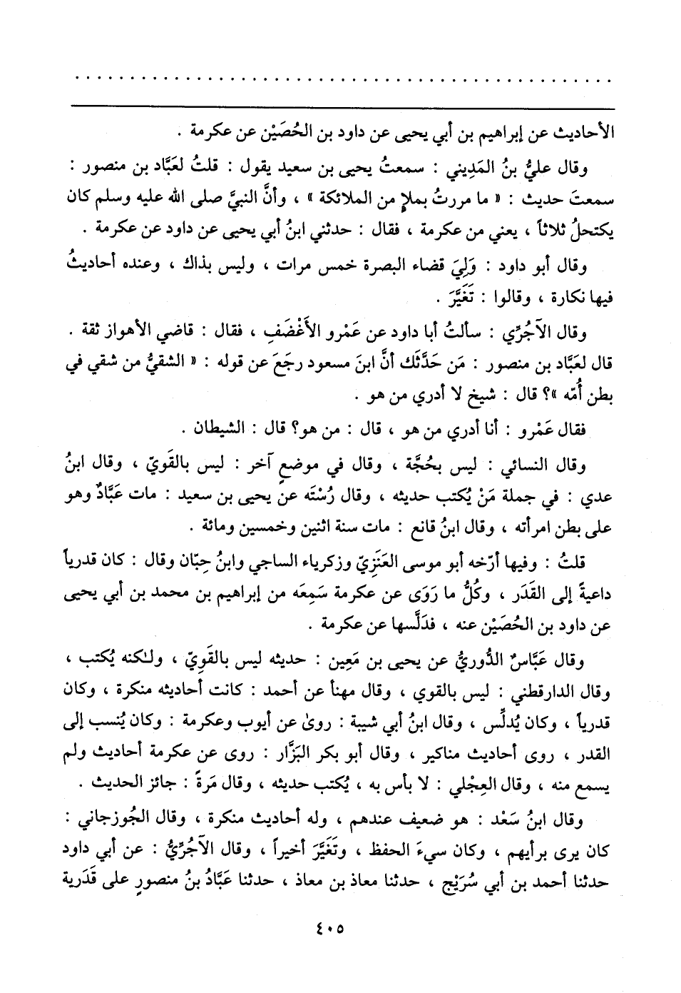 قلتُ: وفيها أرخه أبو موسى العَنَزِي وزكرياء الساجي وابنُ حِبان وقال: كان قدريا داعيةً إلى القَدَر، وكُل ما رَوَى عن عكرمة سَمِعَه من إبراهيم بن محمد بن أبي يحيى عن داود بن الحُصَين عنه، فدَلسها عن عكرمة.