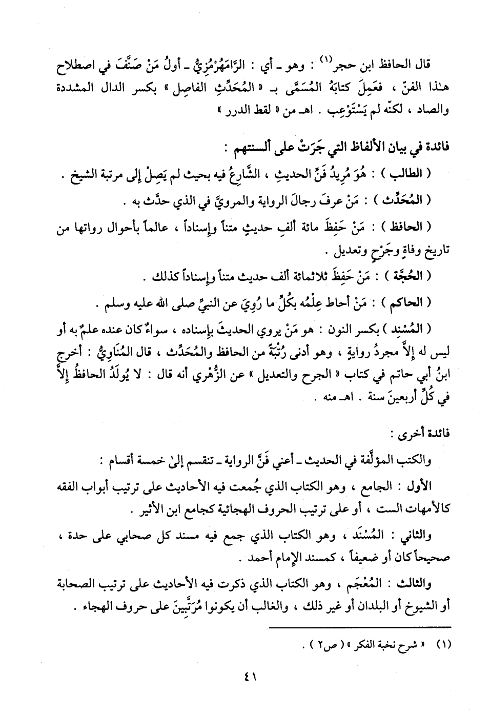 قال الحافظ ابن حجر (١): وهو -أي: الرَّامَهُرْمُزِيُّ- أولُ مَنْ صَنَّفَ في اصطلاح هذا الفن، فعَمِلَ كتابَهُ المُسَمَّى بـ "المُحَدِّثِ الفاصِل" بكسر الدال المشددة والصاد، لكنّه لم يَسْتَوْعِب. اهـ من "لقط الدرر".