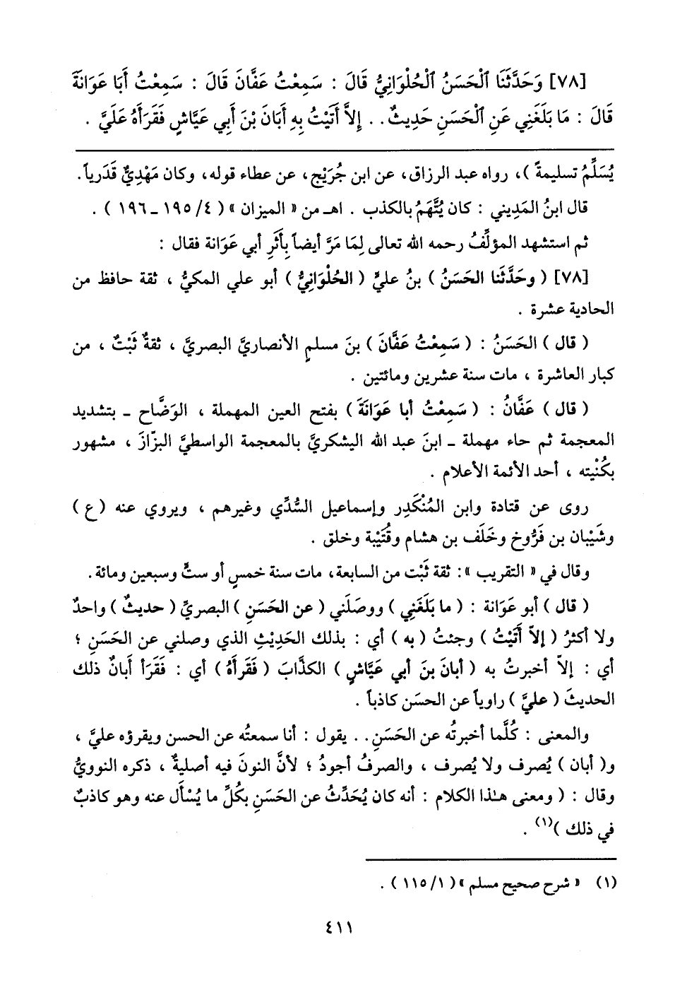 [٧٨] وَحَدَّثَنَا الْحَسَنُ الْحُلْوَانِي قَال: سَمِعْتُ عَفانَ قَال: سَمِعْتُ أَبَا عَوَانةَ قَال: مَا بَلَغَنِي عَنِ الْحَسَنِ حَدِيث .. إِلَّا أتَيتُ بِهِ أَبَانَ بْنَ أَبِي عَياشٍ فَقَرَأَهُ عَلَيَّ