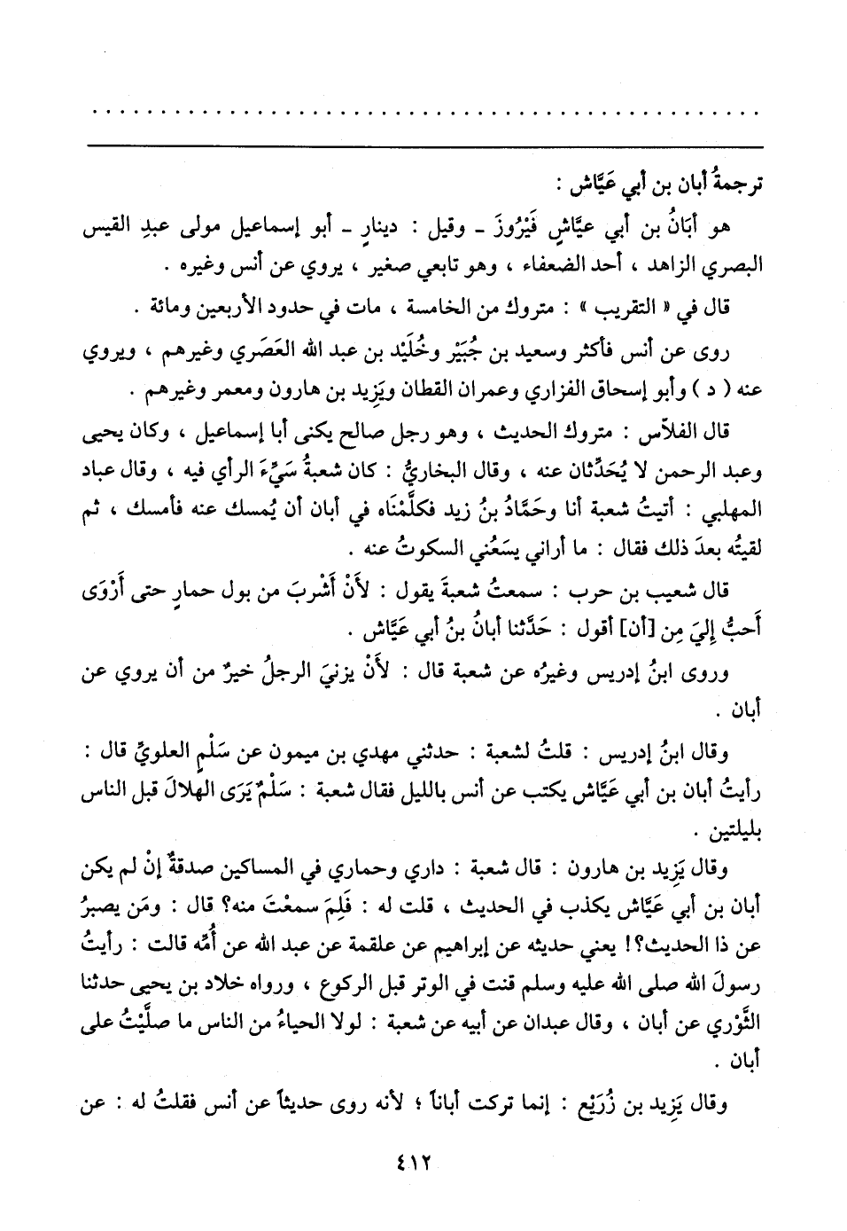قال شعيب بن حرب: سمعتُ شعبةَ يقول: لأَنْ أَشْربَ من بول حمارٍ حتى أَرْوَى أَحب إِليَّ مِن [أن] أقول: حَدثنا أبانُ بن أبي عَياش.