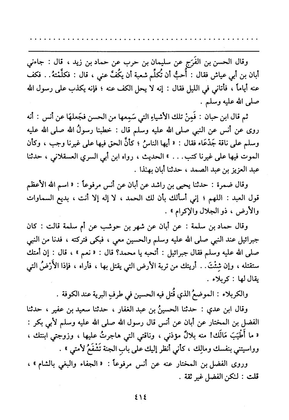 وقال حماد بن سلمة: عن أبان عن شهر بن حوشب عن أم سلمة قالت: كان جبرائيل عند النبي صلى الله عليه وسلم والحسين معي، فبكى فتركته، فدنا من النبي صلى الله عليه وسلم فقال جبرائيل: أتحبه يا محمد؟ قال: "نعم"، قال: إن أمتك ستقتله، وإن شِئْتَ .. أريتك من تربة الأرض التي يقتل بها، فأراه، فإذا الأَرْضُ التي يقال لها: كربلاء.