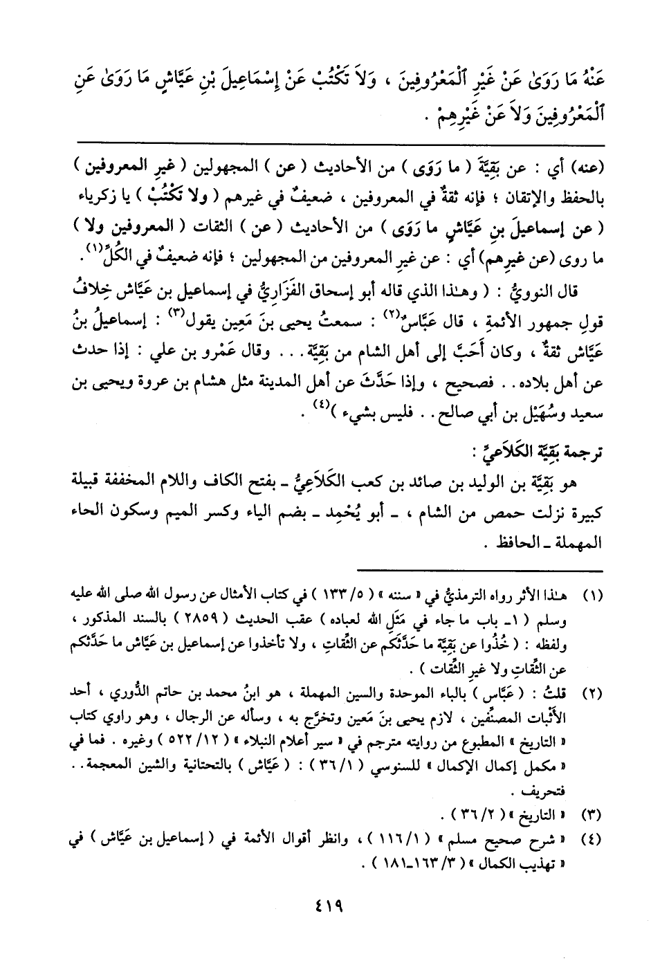 (عنه) أي: عن بقِيَّة (ما رَوَى) من الأحاديث (عن) المجهولين (غيرِ المعروفين) بالحفظ والإتقان؛ فإنه ثقةٌ في المعروفين، ضعيفٌ في غيرهم (ولا يكتُبْ) يا زكرياء (عن إسماعيلَ بنِ عَيَّاشٍ ما رَوَى) من الأحاديث (عن) الثقات (المعروفين ولا) ما روى (عن غيرِهم) أي: عن غيرِ المعروفين من المجهولين؛ فإنه ضعيفٌ في الكُلِّ (١).