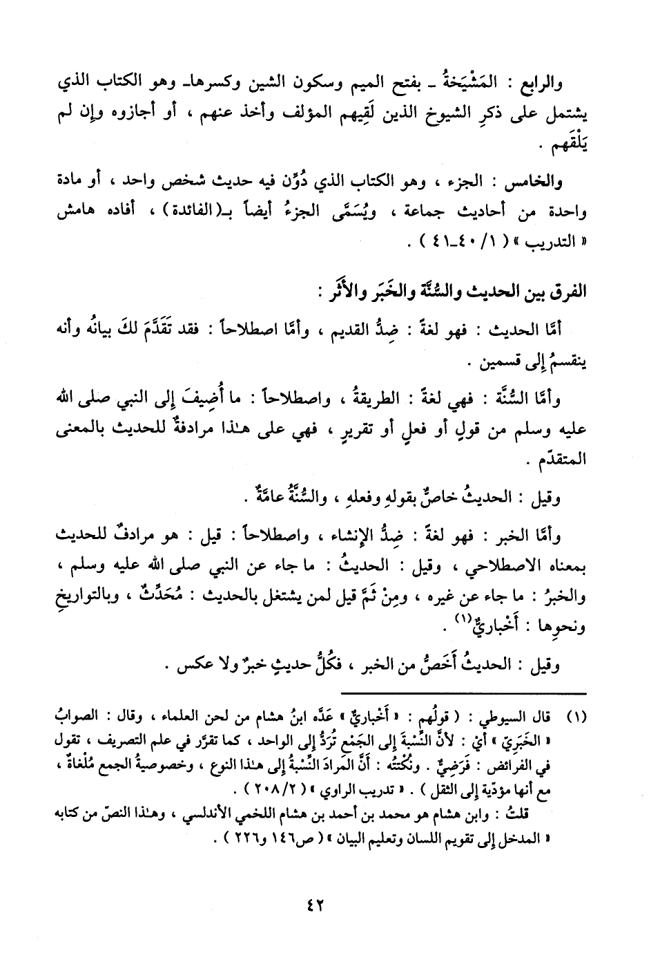 (١) قال السيوطي: (قولُهم: "أَخباريٌّ" عَدَّه ابنُ هشام من لحن العلماء، وقال: الصوابُ "الخَبَرِيّ" أي: لأن النِّسْبةَ إلى الجَمْع تُرَدُّ إلى الواحد، كما تقرَّر في علم التصريف، تقول في الفرائض: فَرَضِيٌّ. ونُكْتتُه: أَن المَرادَ النِّسْبةُ إلى هذا النوع، وخصوصيةُ الجمع مُلْغاةٌ، مع أنها مؤدّية إِلى الثقل). "تدريب الراوي" (٢/ ٢٠٨).