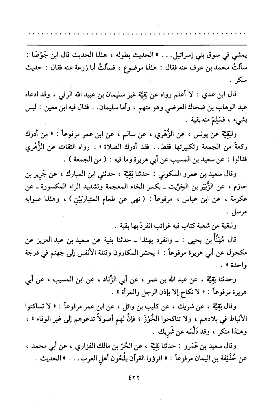 ولبقِية عن يونس، عن الزهْري، عن سالم، عن ابن عمر مرفوعًا: (من أدرك ركعةً من الجمعة وتكبيرتها فقط .. فقد أدرك الصلاة". رواه الثقات عن الزهْري فقالوا: عن سعيد بن المسيب عن أبي هريرة وما فيه: (من الجمعة).