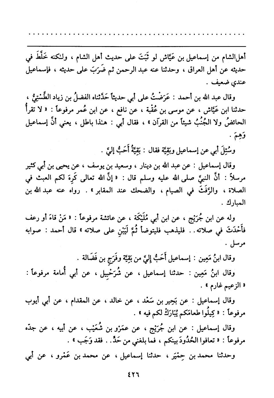 وقال عبد الله بن أحمد: عَرَضْتُ على أبي حديثًا حَدَّثناه الفضلُ بن زياد الطسْتِي، حدثنا ابن عَياش، عن موسى بن عُقْبة، عن نافع، عن ابن عُمر مرفوعًا: "لا تقرأ الحائضُ ولا الجُنُبُ شيئًا من القرآن"، فقال أبي: هذا باطل، يعني أن إسماعيل وَهِمَ.