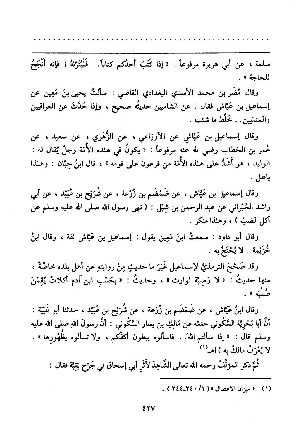 وقال أبو داود: سمعتُ ابنَ مَعِين يقول: إسماعيل بن عَياش ثقة، وقال ابنُ خُزَيمة: لا يُحتَج به.
