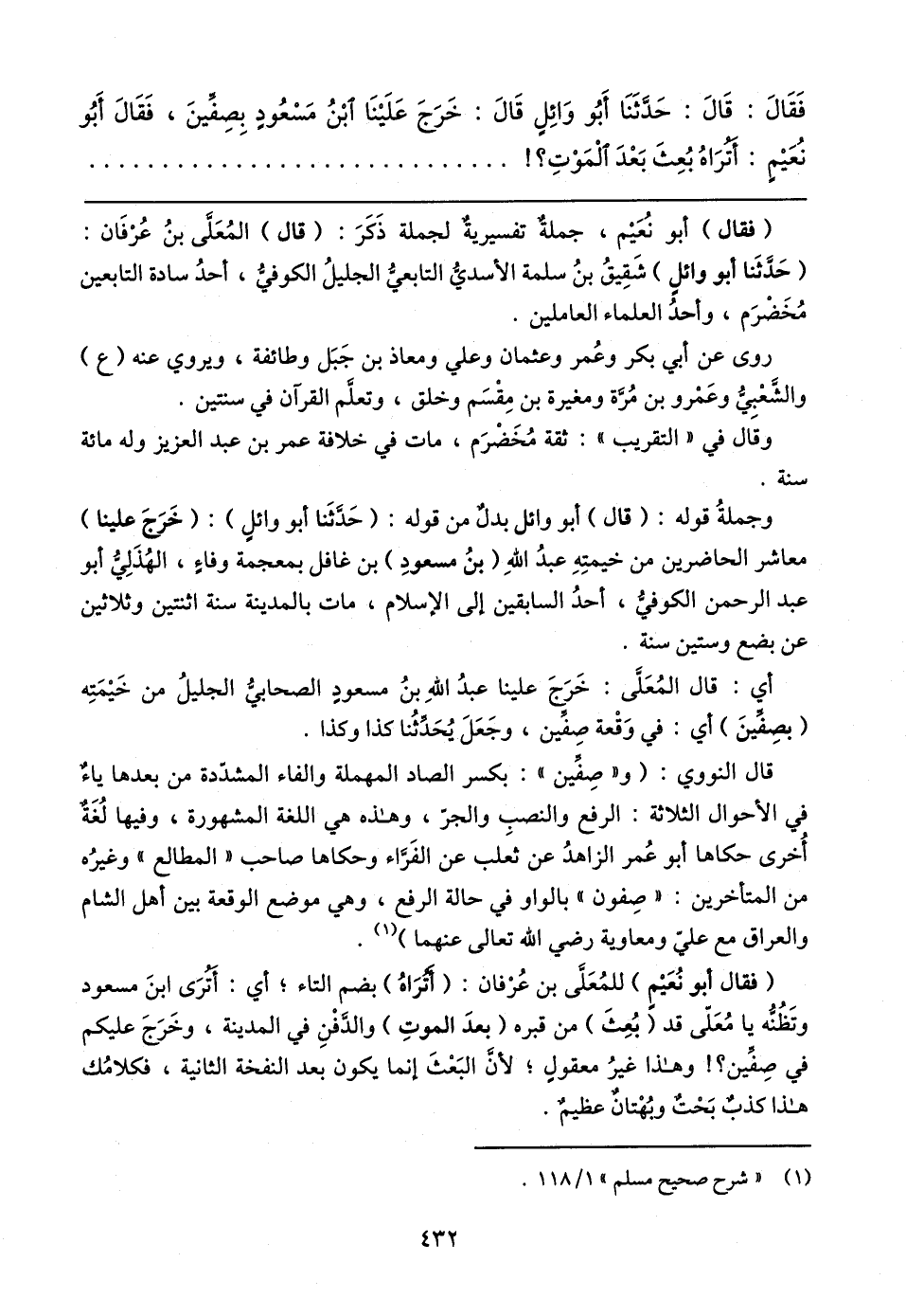 فَقَال: قَال: حَدَّثَنَا أَبُو وَائِلٍ قَال: خَرَجَ عَلَينَا ابْنُ مَسْعُودٍ بِصِفِّينَ، فَقَال أَبُو نُعَيمٍ: أترَاهُ بُعِثَ بَعْدَ الْمَوْتِ؟ !