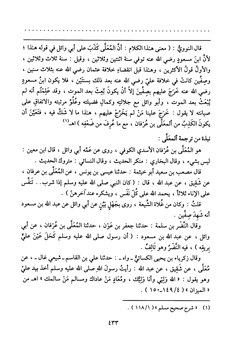 قال النوويُّ: (معنى هذا الكلام: أن المُعَلى كَذَبَ على أبي وائل في قوله هذا؛ لأن ابنَ مسعودٍ رضي الله عنه توفي سنة اثنتين وثلاثين، وقيل: سنة ثلاث وثلاثين، والأولُ قولُ الأكثرين، وهذا قبل انقضاص خلافة عثمان رضي الله عنه بثلاث سنين، وصِفين كانتْ في خلافة عليّ رضي الله عنه بعد ذلك بسنتَين، فلا يكون ابنُ مسعودٍ رضي الله عنه خَرَجَ عليهم بصِفِّينَ إلّا أنْ يكونَ بُعِثَ بعد الموت، وقد عَلِمْتُم أنه لم يُبْعَثْ بعد الموت، وأبو وائل مع جلالتِه وكمالِ فضيلته وعُلُوِّ مرتبته والاتفاقِ على صيانته لا يقول: خَرَجَ علينا مَنْ لم يَخْرُجْ عليهم، هذا ما لا شَكَّ فيه، فتَعَيَّنَ أن يكونَ الكَذِبُ من المعَلَّى بن عُرْفان، مع ما عُرِفَ من ضَعْفِه) اهـ (١).