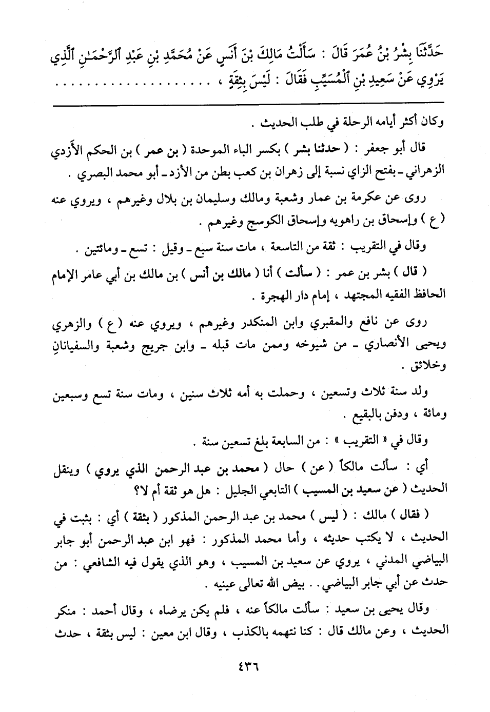 حَدَّثَنَا بِشْرُ بْنُ عُمَرَ قَال: سَأَلْتُ مَالِكَ بْنَ أنسٍ عَنْ مُحَمَّدِ بْنِ عَبْدِ الرحْمَنِ الَّذِي يَرْوي عَنْ سَعِيدِ بْنِ الْمُسَيِّبِ فَقَال: لَيسَ بِثِقَةٍ،