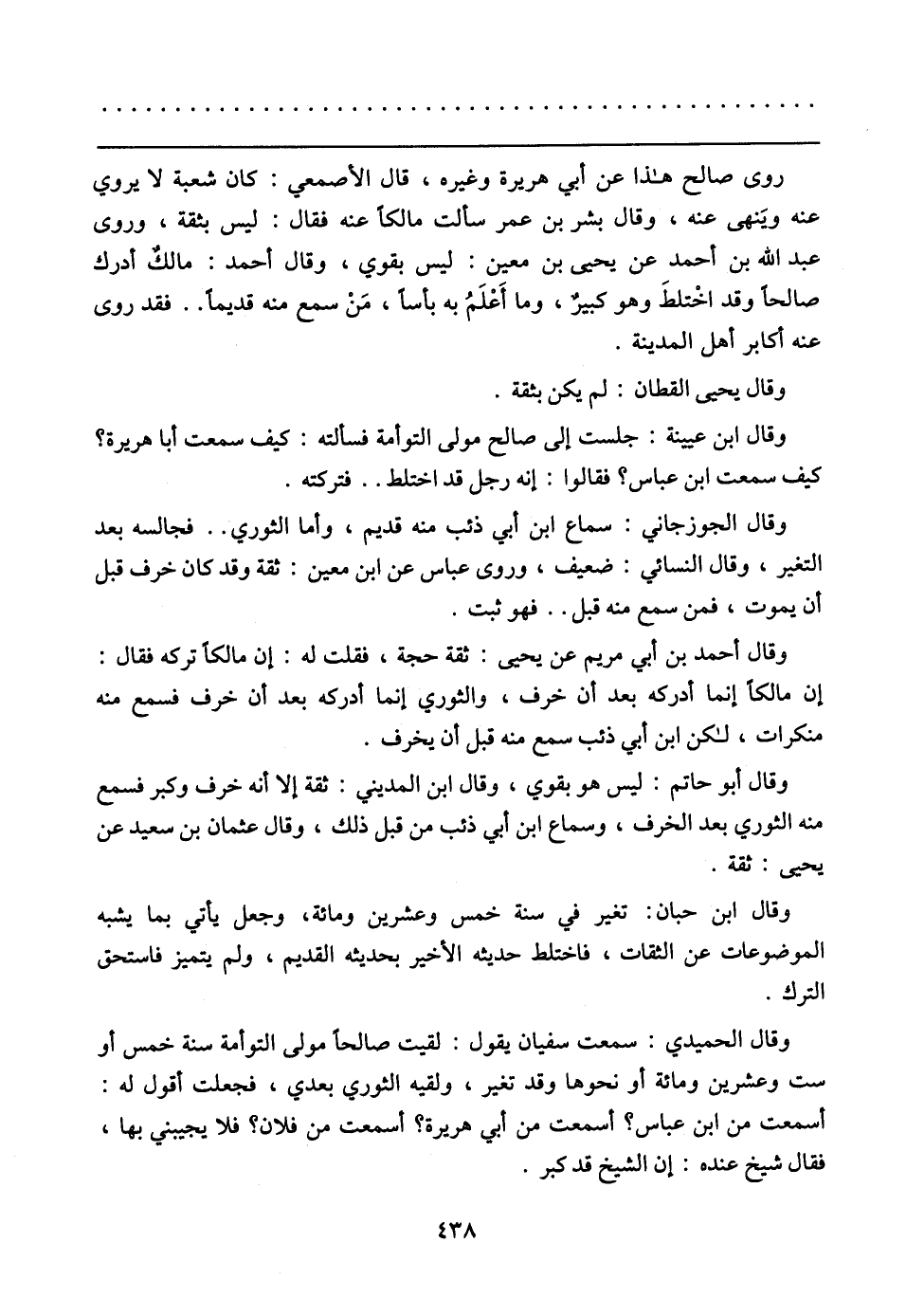 روى صالح هذا عن أبي هريرة وغيره، قال الأصمعي: كان شعبة لا يروي عنه ويَنهى عنه، وقال بشر بن عمر سألت مالكا عنه فقال: ليس بثقة، وروى عبد الله بن أحمد عن يحيى بن معين: ليس بقوي، وقال أحمد: مالك أدرك صالحا وقد اخْتلطَ وهو كبير، وما أَعْلَمُ به بأسا، مَنْ سمع منه قديما .. فقد روى عنه أكابر أهل المدينة.