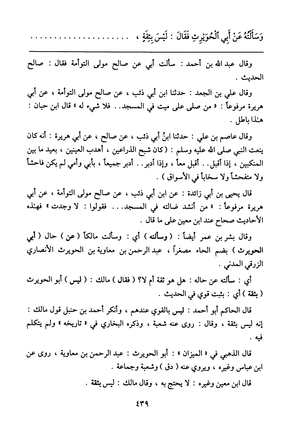 وَسَألْتُهُ عَنْ أَبِي الْحُوَيرِثِ فَقَال: لَيسَ بِثِقَةٍ،
