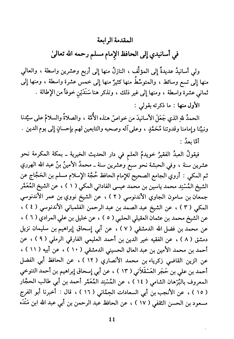 فيقولُ العبدُ الفقيرُ خويدمُ العلمِ في دار الحديث الخيرية -بمكة المكرمة نحو عشرين سنة، وفي الحبشة نحو سبع وعشرين سنة- محمدُ الأمينُ بن عبد الله الهرري ثم المكي: أروي الجامع الصحيح للإِمام الحافظ حُجَّة الإِسلام مسلم بن الحَجَّاج عن الشيخ المُسْنِد محمد ياسين بن محمد عيسى الفاداني المكي (١)، عن الشيخ المُعَمَّر جمعان بن سامون الجاوي الأندنوسي (٢)، عن الشيخ نووي بن عمر الأندنوسي المكي (٣)، عن الشيخ عبد الصمد بن عبد الرحمن الفلمباني الأندنوسي (٤)، عن الشيخ محمد بن عثمان العقيلي الحلبي (٥)، عن خليل بن علي المرادي (٦)، عن محمد بن فضل الله الدمشقي (٧)، عن أبي إِسحاق إِبراهيم بن سليمان نزيل دمشق (٨)، عن الفقيه خير الدين بن أحمد العليمي الفارقي الرملي (٩)، عن أحمد بن محمد الأمين بن عبد العال الحسيني الدمشقي (١٠)، عن أبيه (١١)، عن الزين القاضي زكرياء بن محمد الأنصاري (١٢)، عن الحافظ أبي الفضل أحمد بن علي بن حَجَر العَسْقَلاني (١٣)، عن أبي إِسحاق إِبراهيم بن أحمد التنوخي المعروف بالبُرْهان الشامي (١٤)، عن المُسْنِد المُعَمَّر أحمد بن أبي طالب الحجَّار (١٥)، عن الأنجب بن أبي السعادات الحِمَّاني (١٦)، قال: أخبرنا أبو الفرج مسعود بن الحسن الثقفي (١٧)، عن الحافظ عبد الرحمن بن أبي عبد الله بن مَنْدَه