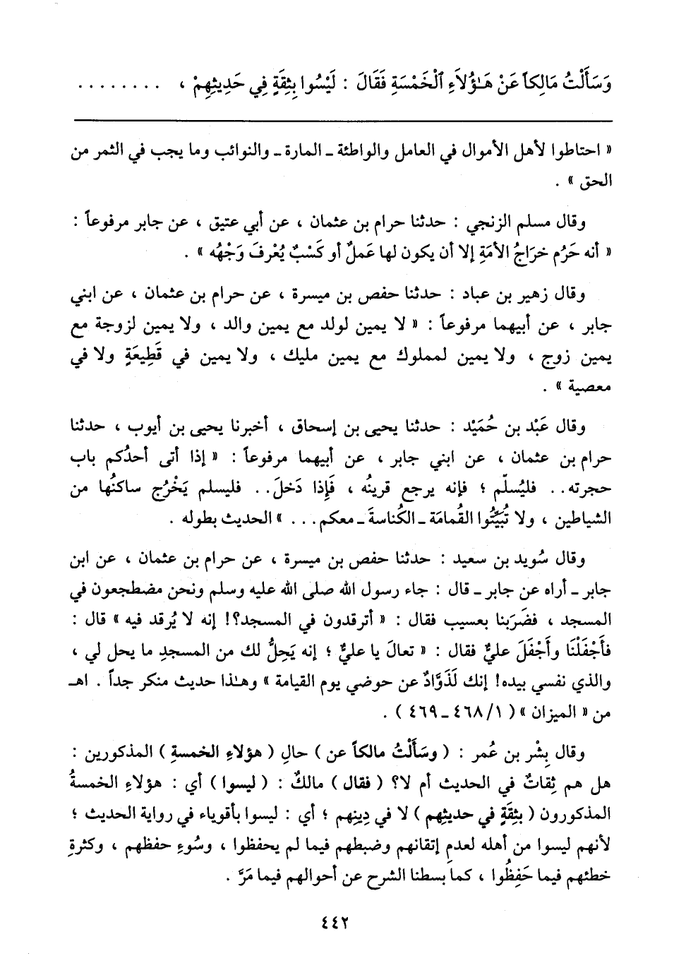 وَسَألْتُ مَالِكًا عَنْ هَؤُلاءِ الْخَمْسَةِ فَقَال: لَيسُوا بِثِقَةٍ فِي حَدِيثِهِمْ،