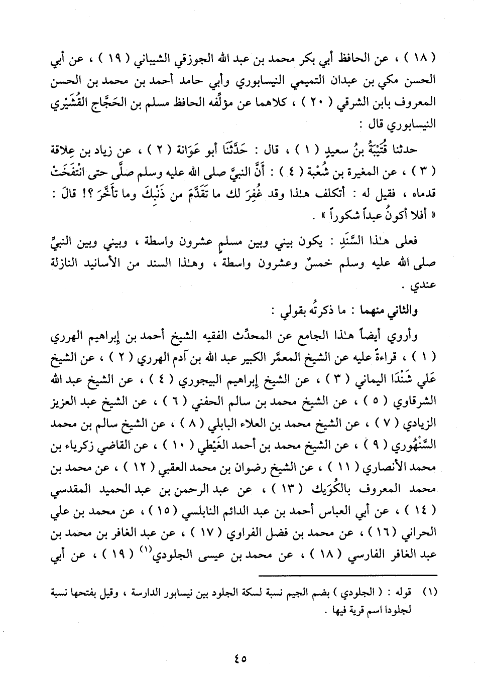 (١٨)، عن الحافظ أبي بكر محمد بن عبد الله الجوزقي الشيباني (١٩)، عن أبي الحسن مكي بن عبدان التميمي النيسابوري وأبي حامد أحمد بن محمد بن الحسن المعروف بابن الشرقي (٢٥)، كلاهما عن مؤلِّفه الحافظ مسلم بن الحَجَّاج القُشَيري النيسابوري قال: حدثنا قُتَيْبَة بن سعيدٍ (١)، قال: حَدَّثَنَا أبو عَوَانة (٢)، عن زياد بن عِلاقة (٣)، عن المغيرة بن شُعْبة (٤): أَنَّ النبي صلى الله عليه وسلم صلَّى حتى انْتفَخَتْ قدماه، فقيل له: أتكلف هذا وقد غُفِرَ لك ما تَقَدَّمَ من ذَنْبكَ وما تأَخَّرَ؟ ! قال: "أفلا أكونُ عبدًا شكورًا".