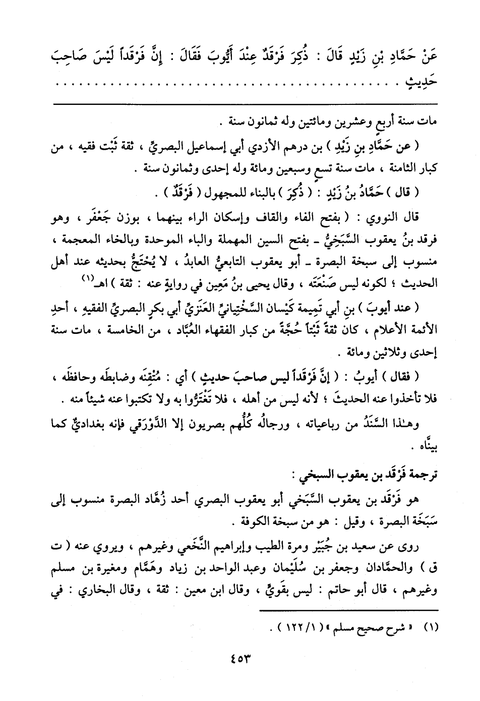 قال النووي: (بفتح الفاء والقاف وإسكان الراء بينهما، بوزن جَعْفَر، وهو فرقد بن يعقوب السَّبَخِيُّ -بفتح السين المهملة والباء الموحدة وبالخاء المعجمة، منسوب إلى سبخة البصرة- أبو يعقوب التابعيُّ العابدُ، لا يُحْتَجُّ بحديثه عند أهل الحديث؛ لكونه ليس صَنْعَتَه، وقال يحيى بن مَعِين في روايةِ عنه: ثقة) اهـ (١).