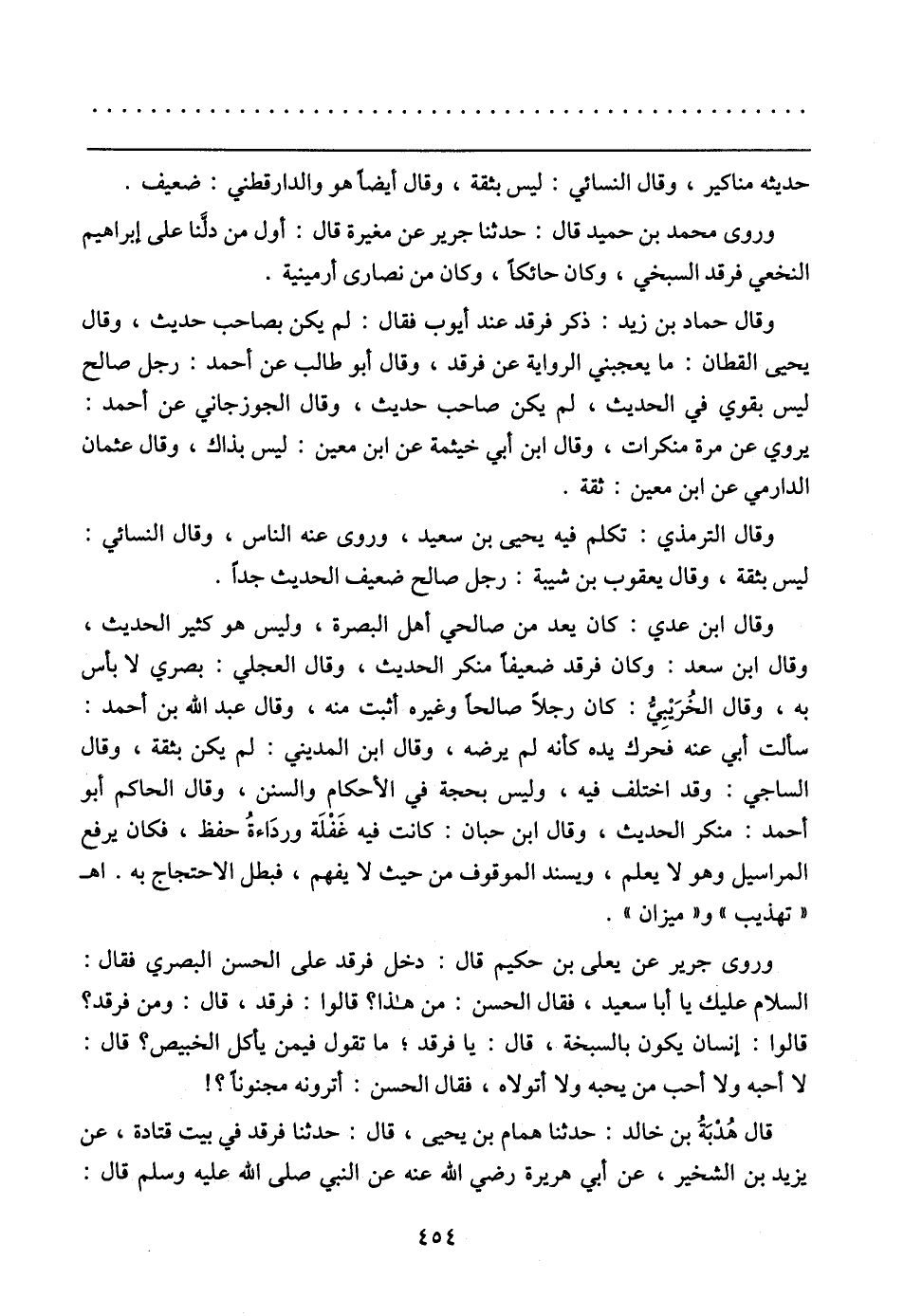 وقال ابن عدي: كان يعد من صالحي أهل البصرة، وليس هو كثير الحديث، وقال ابن سعد: وكان فرقد ضعيفًا منكر الحديث، وقال العجلي: بصري لا بأس به، وقال الخُرَيبِي: كان رجلًا صالحًا وغيره أثبت منه، وقال عبد الله بن أحمد: سألت أبي عنه فحرك يده كأنه لم يرضه، وقال ابن المديني: لم يكن بثقة، وقال الساجي: وقد اختلف فيه، وليس بحجة في الأحكام والسنن، وقال الحاكم أبو أحمد: منكر الحديث، وقال ابن حبان: كانت فيه غَفْلَة وردَاءةُ حفظ، فكان يرفع المراسيل وهو لا يعلم، ويسند الموقوف من حيث لا يفهم، فبطل الاحتجاج به. اهـ "تهذيب" و"ميزان".