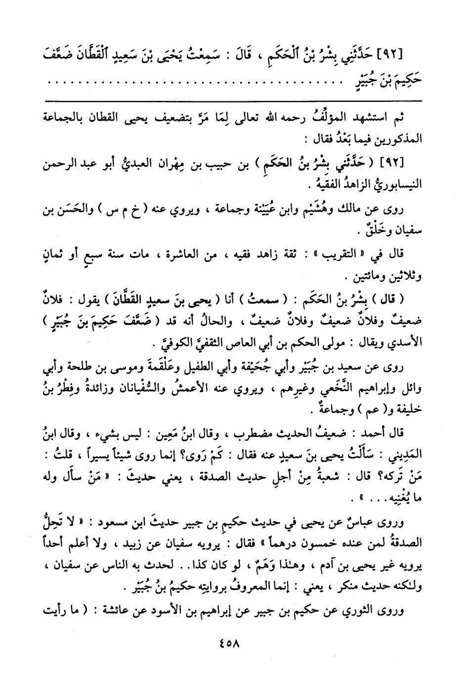 [٩٢] حَدَّثَنِي بِشْرُ بْنُ الْحَكَمِ، قَال: سَمِعْتُ يَحْيَى بْنَ سَعِيدِ الْقَطَّانَ ضَعَّفَ حَكِيمَ بْنَ جُبَيرٍ