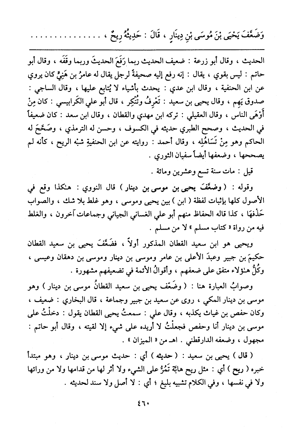 ويحيى هو ابن سعيد القطان المذكور أولًا، فضَعَّفَ يحيى بن سعيد القطان حكيمَ بن جبير وعبدَ الأعلى بن عامر وموسى بن دينار وموسى بن دهقان وعيسى، وكُلُّ هؤلاء متفق على ضعفهم، وأقوالُ الأئمة في تضعيفهم مشهورة.