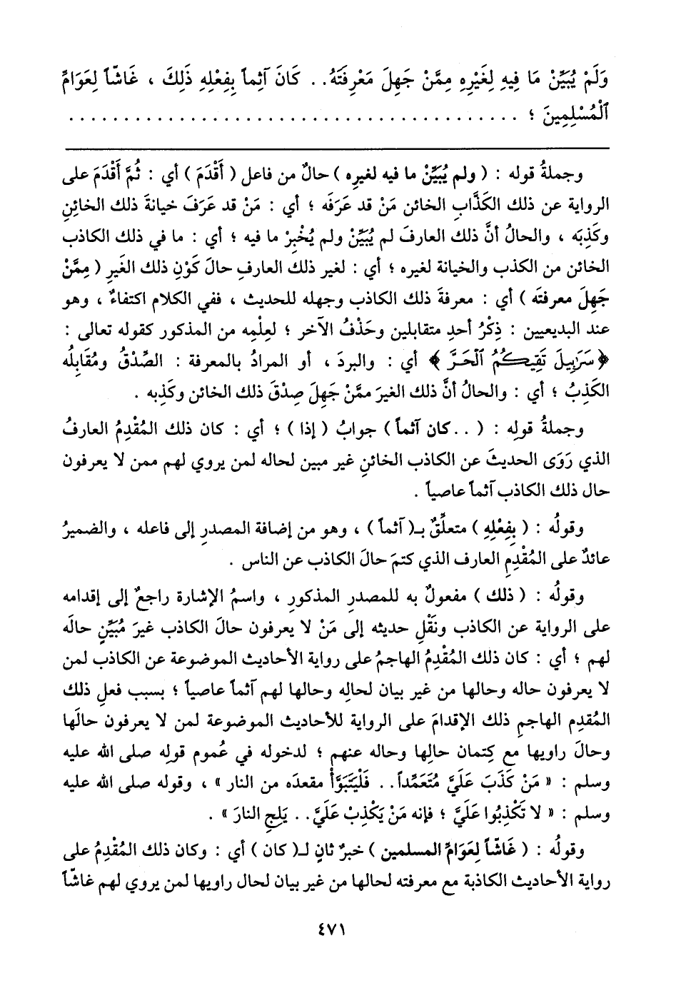 وقولُه: (ذلك) مفعولٌ به للمصدرِ المذكورِ، واسمُ الإشارة راجعٌ إلى إقدامه على الرواية عن الكاذب ونَقْلِ حديثه إلى مَنْ لا يعرفون حال الكاذب غيرَ مُبيِّنٍ حاله لهم؛ أي: كان ذلك المُقْدِمُ الهاجمُ على رواية الأحاديث الموضوعة عن الكاذب لمن لا يعرفون حاله وحالها من غير بيان لحالِه وحالها لهم آثمًا عاصيًا؛ بسبب فعلِ ذلك المُقدِم الهاجمِ ذلك الإقدامَ على الرواية للأحاديث الموضوعة لمن لا يعرفون حالها وحال راويها مع كِتمان حالِها وحاله عنهم؛ لدخوله في عُموم قوله صلى الله عليه وسلم: "مَنْ كَذَبَ عَلَيَّ مُتَعَمِّدًا .. فَلْيَتَبَوَّأْ مقعدَه من النار"، وقوله صلى الله عليه وسلم: "لا تَكْذِبُوا عَلَيَّ؛ فإنه مَنْ يَكْذِبْ عَلَيَّ .. يَلجِ النارَ".